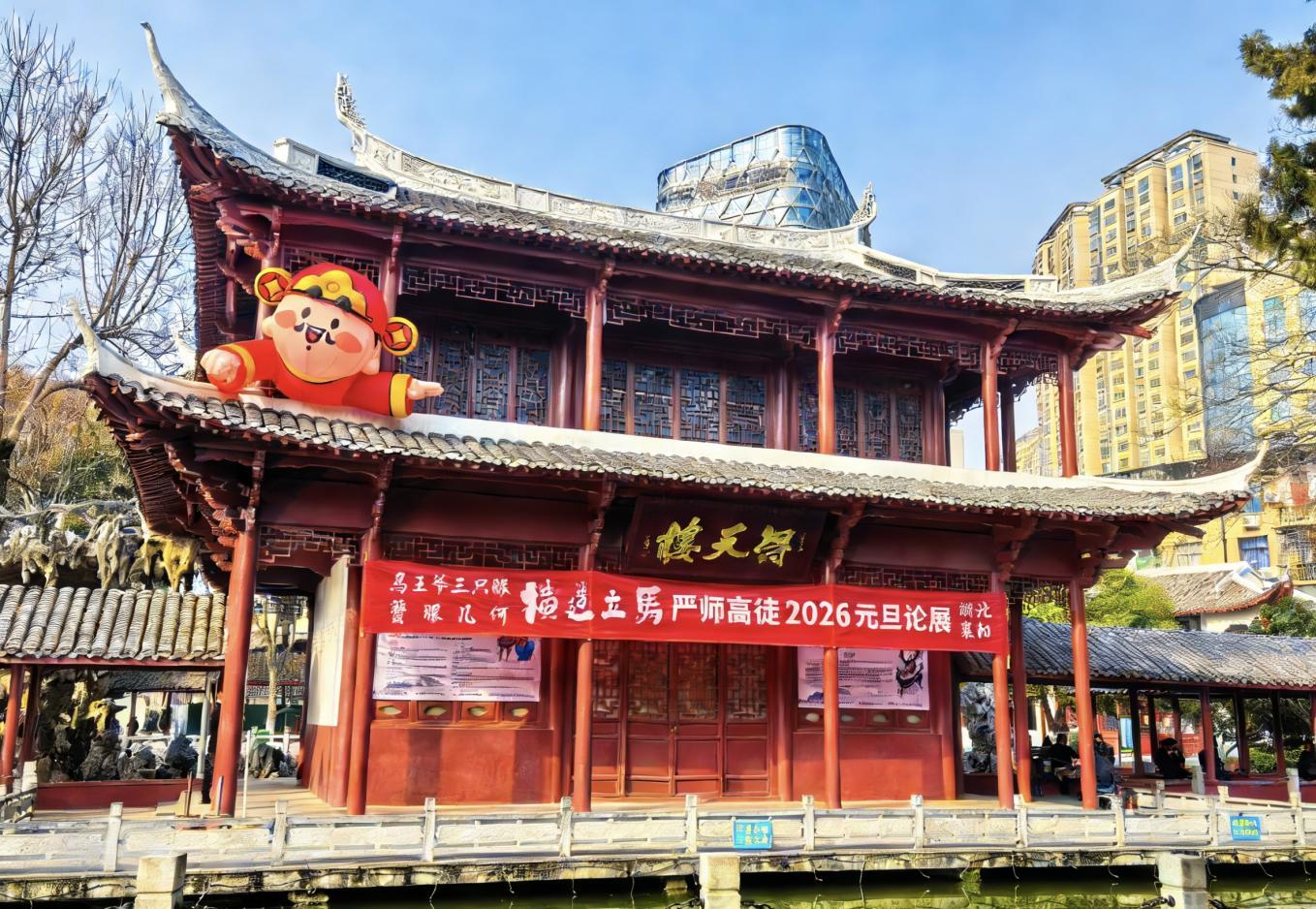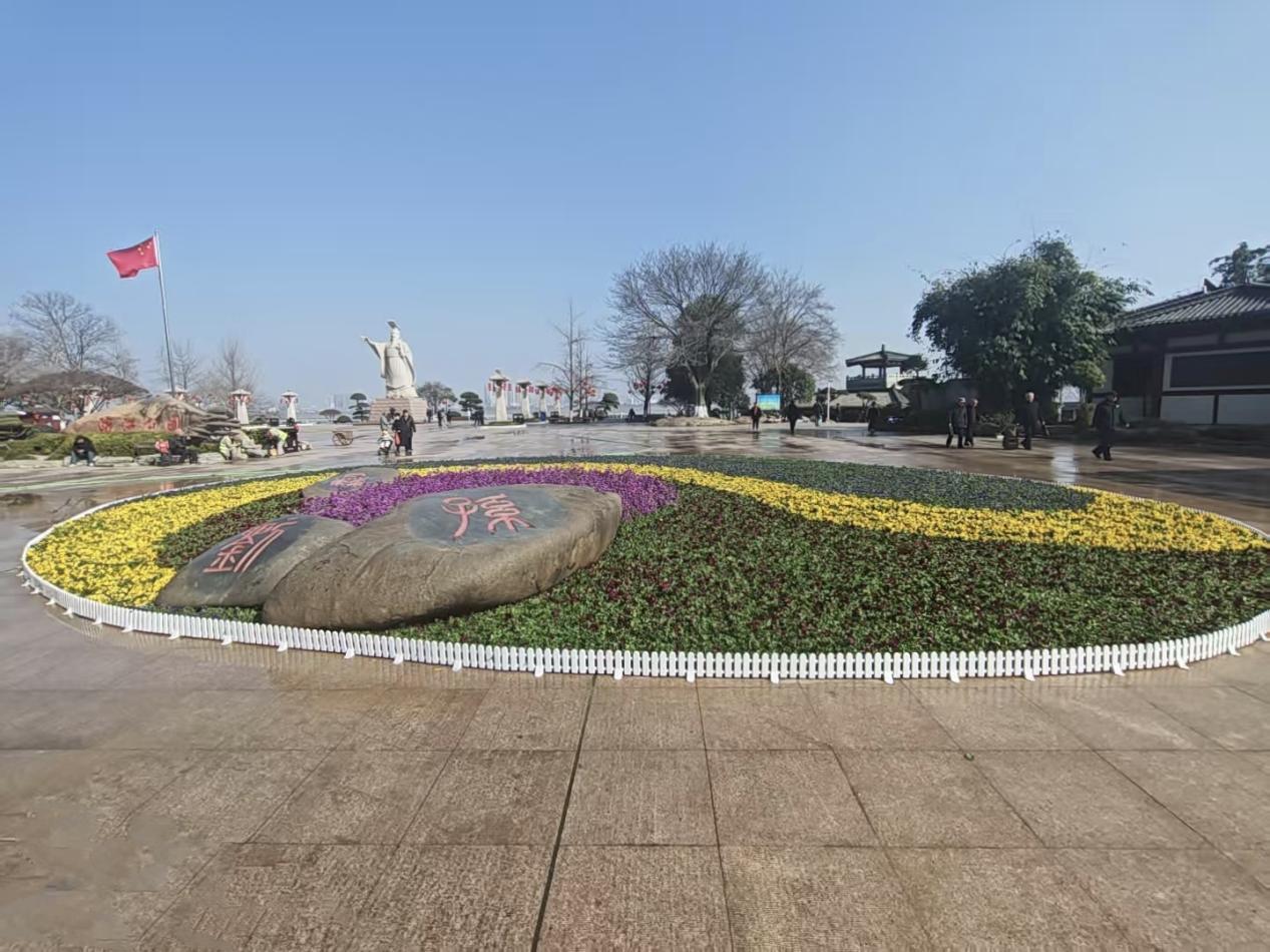 公园广场,是节日氛围营造的重要节点。中山公园、明月公园内,一串串红灯笼、一条条祝福福带悬挂于苍翠树木之间,与工农兵雕像、屈原雕像等人文景观相映成趣,平添几分庄重与喜庆。临江仙公园则更具现代创意,新设置的红色小提琴阶梯、“风”字形艺术小品等,成为年轻人拍照打卡的热门背景。