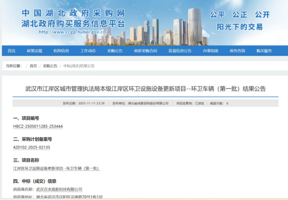 近日,武汉城投水务集团旗下汉水高新公司成功中标“武汉市江岸区环卫设施设备更新项目—环卫车辆(第一批)”。此次中标不仅是汉水高新延伸水务环保产业链、深化城市民生服务的关键进展,也为提升区域环境治理水平、完善城市功能注入了新的国企动能。中标结果公告该项目聚焦“绿色化、智能化、标准化”方向,计划通过1-2年时