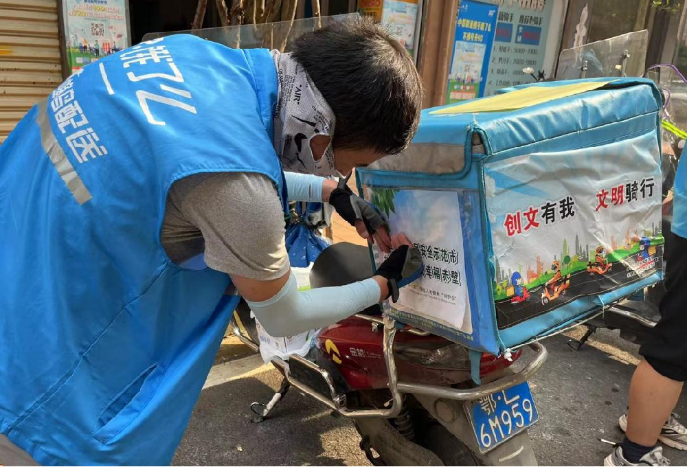 近日,在赤壁市市场监督管理局的倡议下,美团、饿了么网络订餐平台近200名送餐骑手自发变身宣传员,为赤壁市创建“省级食品安全示范市”奉献力量。送餐骑手正在张贴宣传标语在赤壁街头,送餐骑手将“长江十年禁渔生态保护”“创建省级食品安全示范城市”“咸宁市创建国家食品安全示范城市”等不同的标语贴在他们独有的宣传载