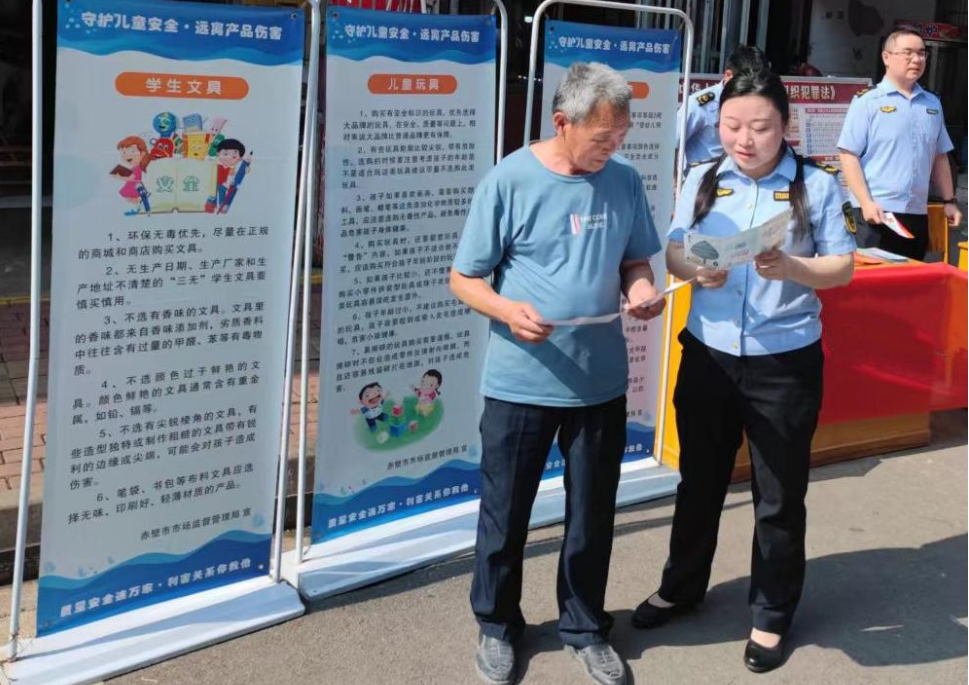 “六一”将至,为守护儿童用品安全,近日,赤壁市市场监督管理局围绕“守护儿童安全 远离产品伤害——儿童用品安全行”主题开展了一系列宣传活动。5月18日,监管人员在赤马港街道居民区和集贸市场,开展了现场宣传活动,通过设立宣传展板、发放宣传资料、现场解答咨询等方式,向周边商户和消费者宣传儿童产品质量安全知识,