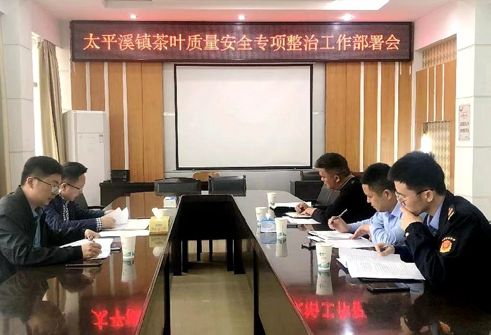 茶产业是湖北省宜昌市夷陵区太平溪镇农业支柱产业和重要民生产业之一。为推进茶叶标准化生产、规范化经营,近日,太平溪镇开展茶叶质量安全专项整治工作,进一步落实茶叶质量安全监管责任,从源头提升茶叶品质,助力茶农茶企丰产丰收。5月5日下午,太平溪镇政府组织召开茶叶质量安全专项整治工作部署会议,太平溪镇食安办、