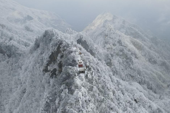 “白雪却嫌春色晚,故穿庭树作飞花。”连日来,受低温天气影响,湖北省十堰市高寒地区迎来雨雪天气,在平均海拔千余米的小川村,雪后的山川大地披上了银装,云雾缭绕,皑皑的白雪将山川绘成了一幅淡淡的水墨画,美不胜收。赛武当原名伏龙山,主峰海拔 1730米,因山高赛过武当山主峰而得名,位于湖北赛武当省级自然保护区管理