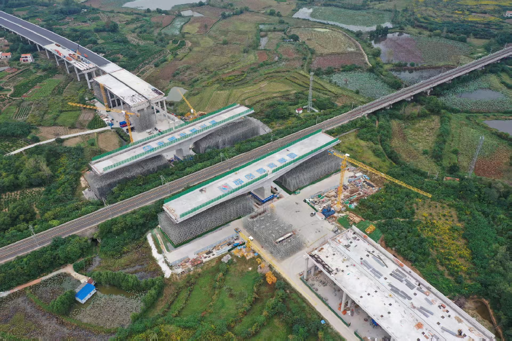 10月14日零时,随着现场总指挥一声令下,武天高速公路(武汉至重庆高速公路武汉至汉川段)项目关键控制性工程——跨沪蓉铁路大桥转体施工正式启动。两座总重均约1.6万吨的T型刚构梁犹如钢铁巨龙,在夜色中同步转身。历时72分钟成功转体,精准到达预定位置,转体过程安全平稳,两座桥梁成功跨越沪蓉铁路上下行线,在空中实现