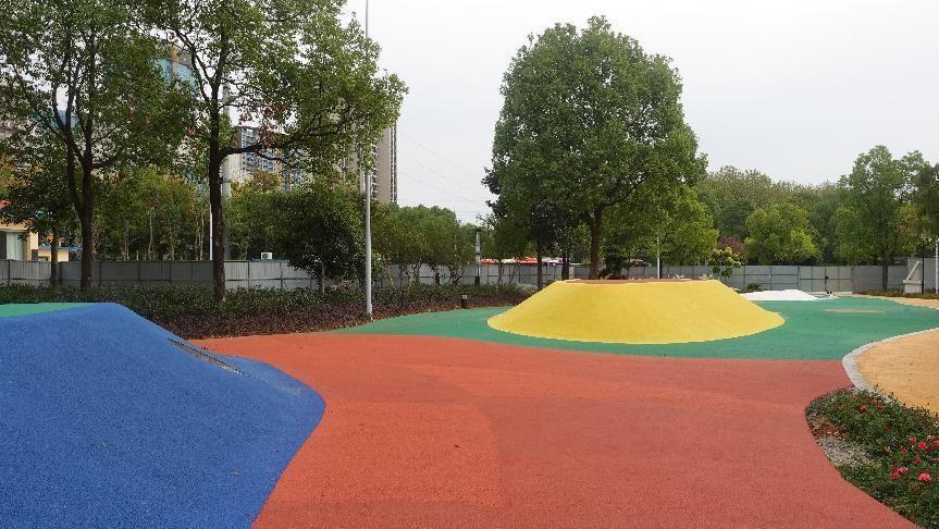 “妈妈,我想进去玩!”在黄石市黄石港区公园路旁,高高竖起的工地围挡显示此处正在施工中,一位小朋友却拉着妈妈执意从门上的一个方形小口向内张望。顺着小朋友的视线望去,蓝、红、黄、绿等鲜艳、明亮的大色块“蹦入”眼帘,围挡内部别有洞天,俨然是个充满趣味的儿童乐园,难怪他不肯离去。“小朋友,广场还没建好呢,等
