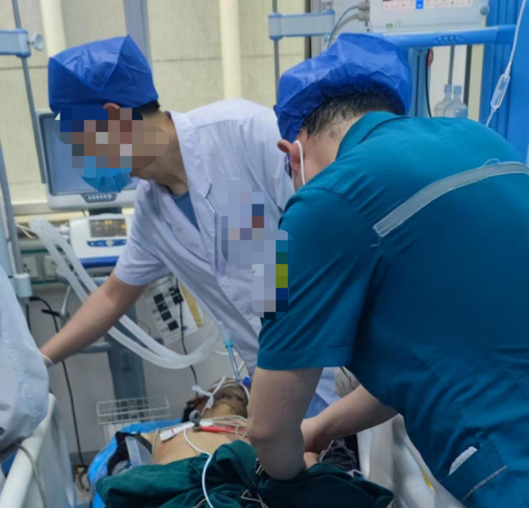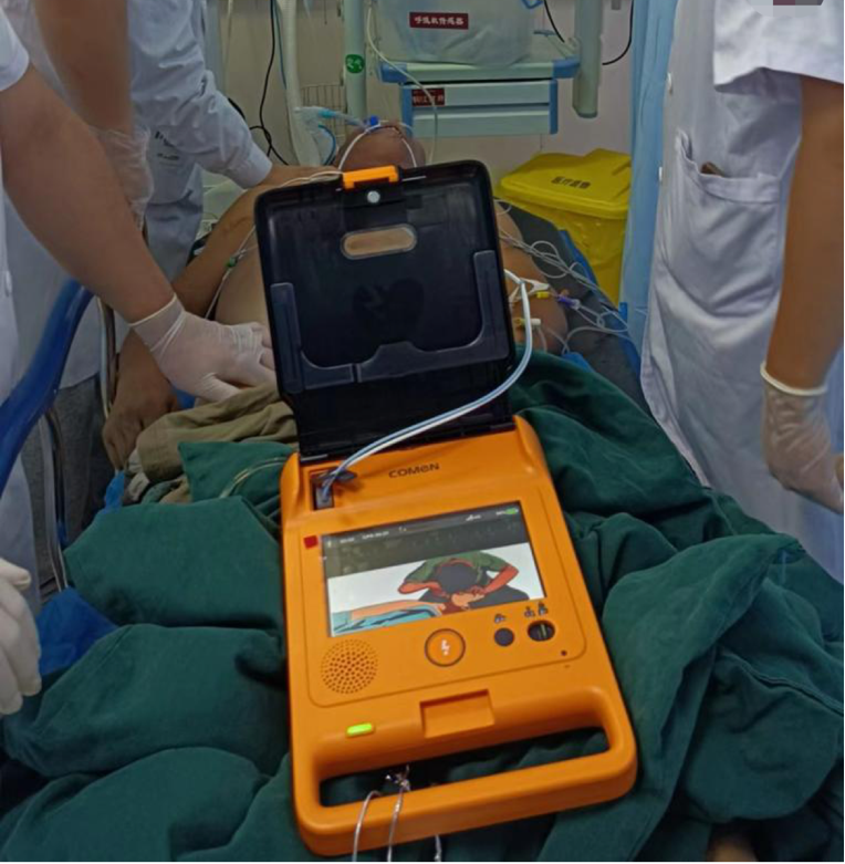 6月4日,74岁的张先生(化名)突发心梗,被送入急诊,入院时昏迷、意识不清,在医护人员要为其进行抢救时,患者病情急转直下,呼吸微弱、颈动脉搏动消失。抢救现场见状,急诊医生利用AED(自动体外除颤器),将电极片贴至患者胸前,AED自动侦测患者心律,给予电击建议。医护人员依据语音提示,为患者进行除颤。除颤后,张先
