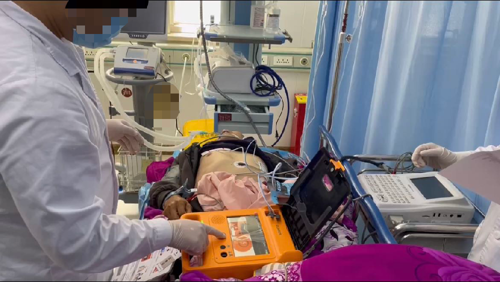 5月26日,王大爷(化名)年龄67岁,因外出登山劳累过度在回家的路上摔倒,家人立刻搀扶起身后继续往家的方向走去,大约7分钟后王大爷突感心脏不适,家人立刻拨打120进入最近的社区医院,随后王大爷意识模糊,没有呼吸,监护显示发生室颤。抢救中当值医生立刻从墙上的挂箱中取出自动体外除颤器,打开盖子,按语音和屏幕操作提