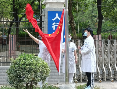 喜笑颜开迎国庆“我们万众一心,冒着敌人的炮火前进!前进!前进进!”9月29日上午,为庆祝中华人民共和国成立73周年,喜迎党的二十大胜利召开,武汉紫荆医院隆重举行升国旗仪式暨“唱响新时代,逐梦紫荆人”合唱活动,百余名医护人员身着白大褂,目视着国旗,齐唱国歌。列队向国旗致敬国旗升起的瞬间“因为平时上班太忙,没