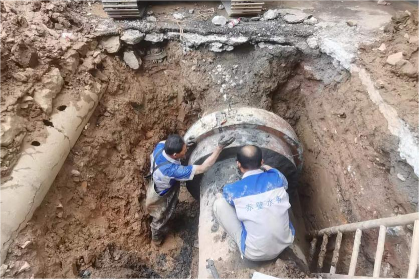 “这里在冒水,测漏仪听得到DN800主管道下有异响回音。”9月22日凌晨,赤壁市沿河大道209号非机动车道一个供水抢修现场,赤壁市水务集团有限公司(以下简称“赤壁市水务集团”)捷顺维修公司维修部部长石磊说。抢修现场“路基沉降、负荷增大、年代久远等原因都会造成管网突发漏损。”捷顺维修公司副经理丁崇斌介绍,这个月是