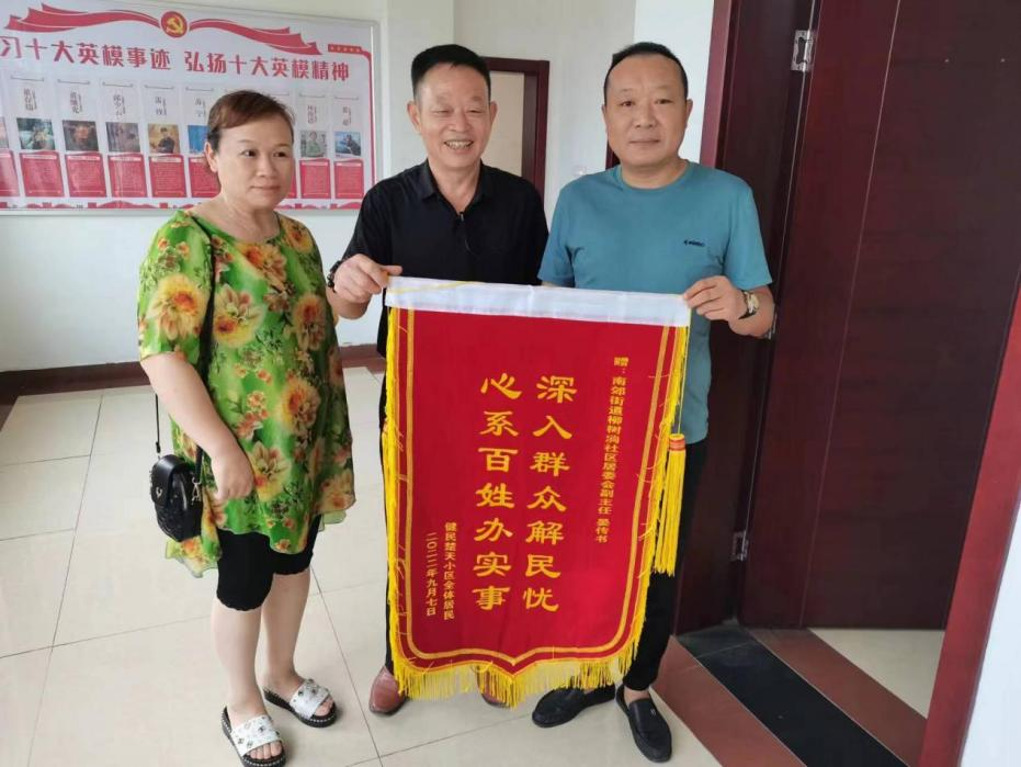 9月20日上午,随州市曾都区南郊街道柳树淌社区楚天药厂小区居民代表将一面写着“深入群众解民忧,心系百姓办实事”的锦旗送到柳树淌社区居委会副主任晏传书办公室,表达该小区居民对老旧小区改造工作的肯定及对工作人员辛勤付出的感激之情。赠送锦旗现场原来,该居民所居住的南郊楚天药厂小区是1985年的房改房小区,共4栋15