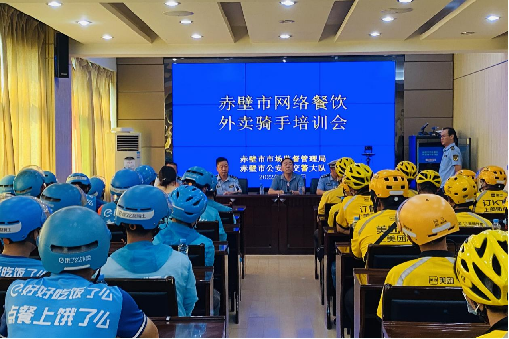 为深入贯彻湖北省、咸宁市市场监督管理局食品安全“守底线、查隐患、保安全”工作要求,进一步强化外卖“骑手”食品安全知识,提升“骑手”生命安全意识,近日,赤壁市市场监督管理局、赤壁市公安局交警大队组织赤壁市美团、饿了么两个平台外卖“骑手”70余人在赤壁市市场监督管理局六楼召开安全知识培训会。培训会现场会上