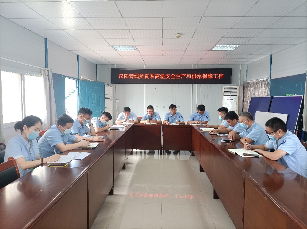 武汉的夏天,骄阳似火。近日,武汉市气象台连续发布高温橙色预警信号,在持续晴热的高温天气下,武汉市水务集团有限公司汉阳供水部管线所工作人员用信念坚守岗位,用辛劳和汗水确保武汉汉阳区域安全供水。会议现场为保障高温天气及汛期的供水安全,设施巡线专班人员每日加大了汉阳地区管网、闸门和消防设施、在建拆迁工地的