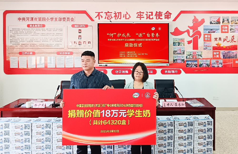金秋时节,爱心涌动。9月12日上午,“河”护成长 “源”自营养——学生饮用奶捐赠活动在河源市第四小学举行。中国学生饮用奶(河源)推广中心向河源市直公办义务教育学校全体学生捐赠近7万盒总价值18万元的伊利学生奶,引导少年儿童树立健康营养饮食观,助力河源学子健康启程。公益捐赠活动现场河源市教育局党组成员、副局长