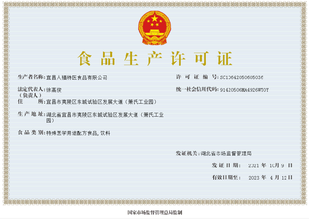 10月9日,记者获悉,宜昌人福特医食品有限公司(以下简称宜昌人福特医食品)成功取得湖北省市场监管局颁发的全省首张特殊医学用途配方食品生产许可证,实现了宜昌市乃至湖北省特殊医学用途配方食品生产的“零突破”。湖北省首张特殊医学用途配方食品生产许可证据悉,特殊医学用途配方食品,是为满足进食受限、消化吸收障碍、