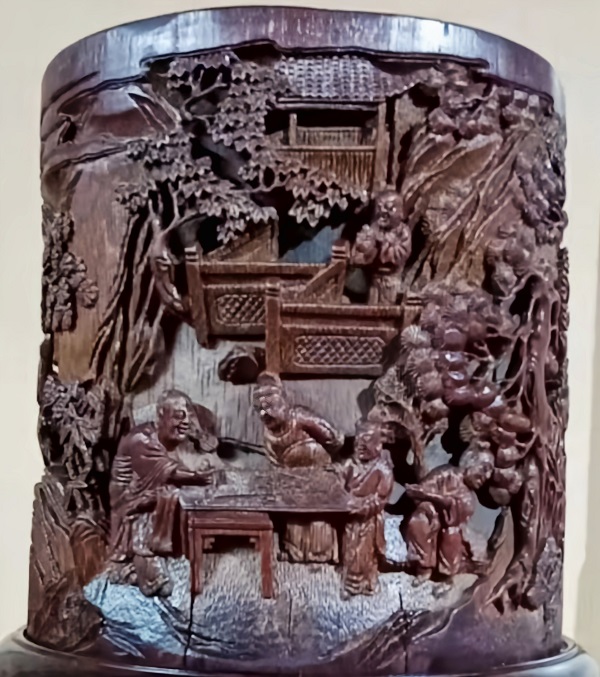 嘉定派竹刻是明代朱鹤创立的竹刻工艺流派,因其为嘉定人,故名。嘉定派竹刻以镂刻为主,重在深刻,且刀法稳重,作品多以透雕、深雕、高浮雕为主。由于重视刀法运用,能以笔法运于刀法,运刀如笔,将画法与印法等运用到竹刻中,使这古老的工艺脱离一般的匠人之作而成为艺术。清中期嘉定派走向鼎盛时期,竹雕笔筒以嘉定派最为